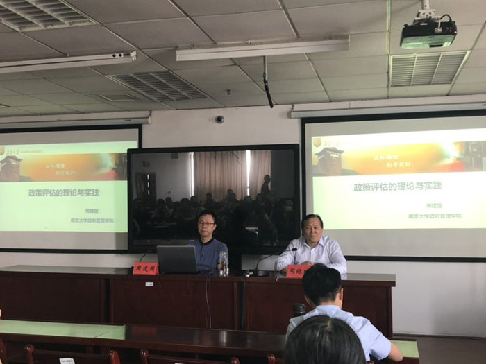 6月1日下午,南京大学政府星空网页版登录入口副院长、博士生导师周建国教授应邀,在三江楼1819报告厅做了题为《政策评估的理论与实践》的学术报告。星空网页版登录入口党委书记、公共管理学科带头人、博士生导师周绿林教授主持讲座。公共管理学科教师、研究生和MPA2017、MPA2018级学员等共同聆听了报告。